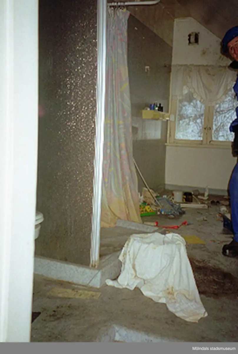 Badrum i bostadshuset Villa Solbacken i Krokslätt, januari 1995. En okänd person skymtas till höger.