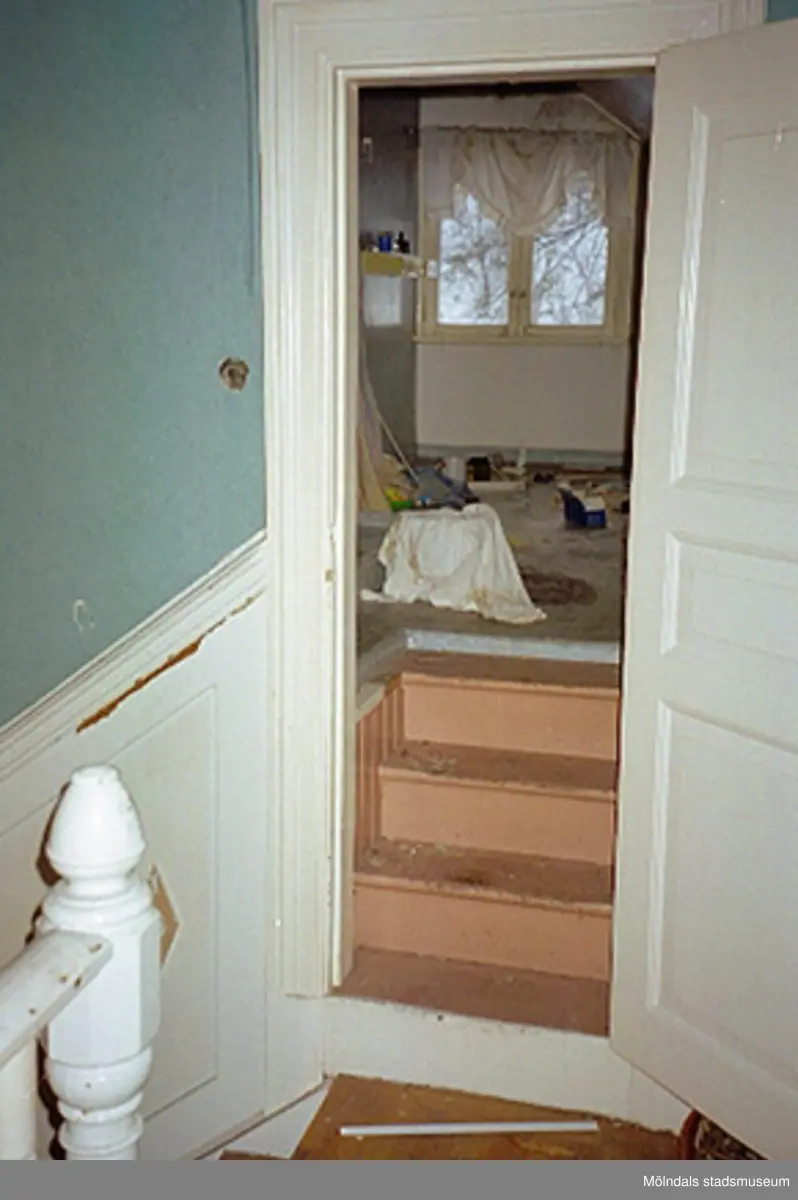 Dörröppning till badrum i bostadshuset Villa Solbacken i Krokslätt, januari 1995. Byggnadsdetaljer: Dörr och trappsteg.