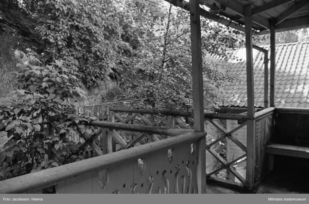 Titel: Kvarnfallet 24 vid Götaforsliden i Mölndals Kvarnby. Mangårdsbyggnad till kvarn (bostad). Veranda: snickeridetaljer med "gångbro" över till upphöjd gångbana.