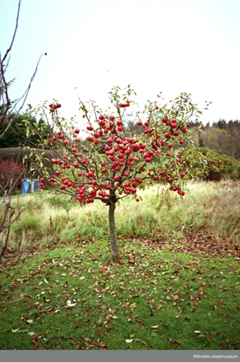 Foto taget utmed Mölndalsån år 1993. Ett äppleträd fullt med frukt.