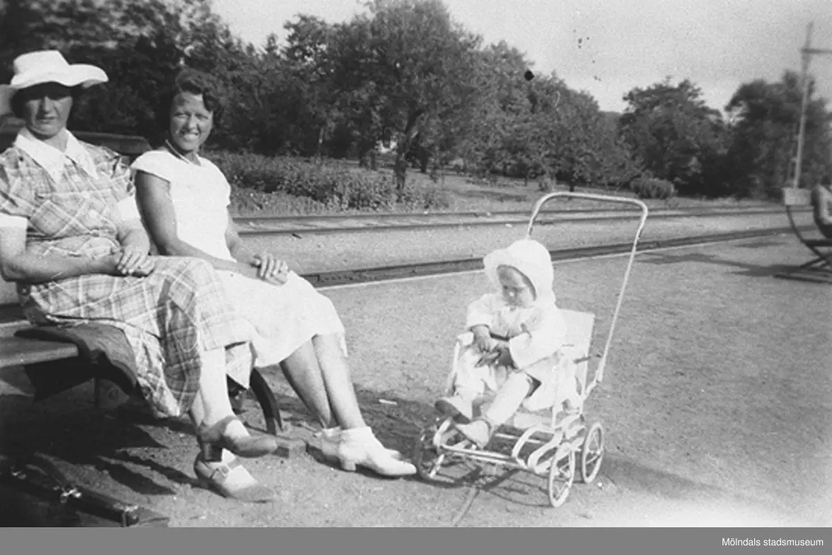 Sommar i Lindome, början av 1940-talet. Två kvinnor sitter på en bänk och ett litet barn sitter i en kärra. I bakgrunden ses tågspår.