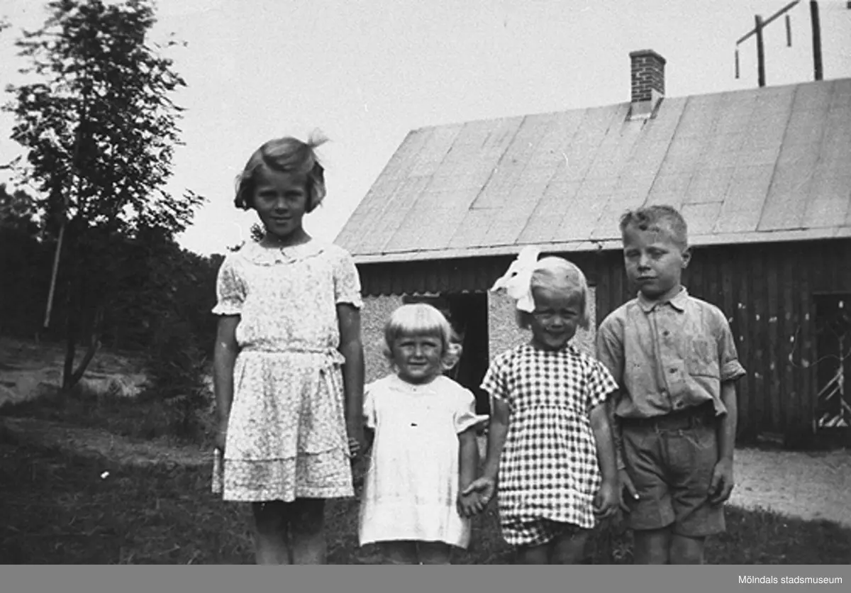 Sommar i Lindome, början av 1940-talet. Fyra barn poserar framför kameran. I bakgrunden ses en lada.