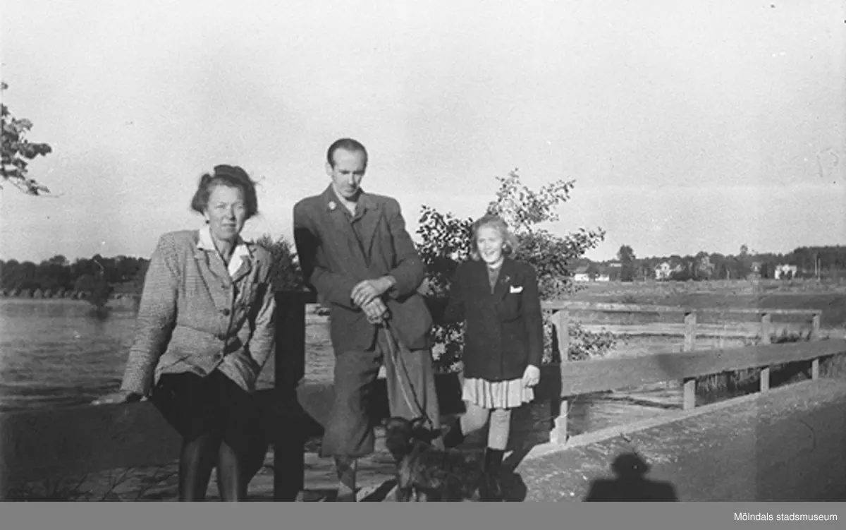 Sommar i Lindome i början av 1940-talet. En kvinna, en man och ett barn står med en hund i koppel vid en grusväg.