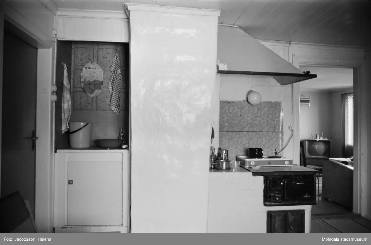 Roten L 13 i Mölndals Kvarnby. Lägenhetsinteriör från rotebostad. Kök med gammal vedspis.