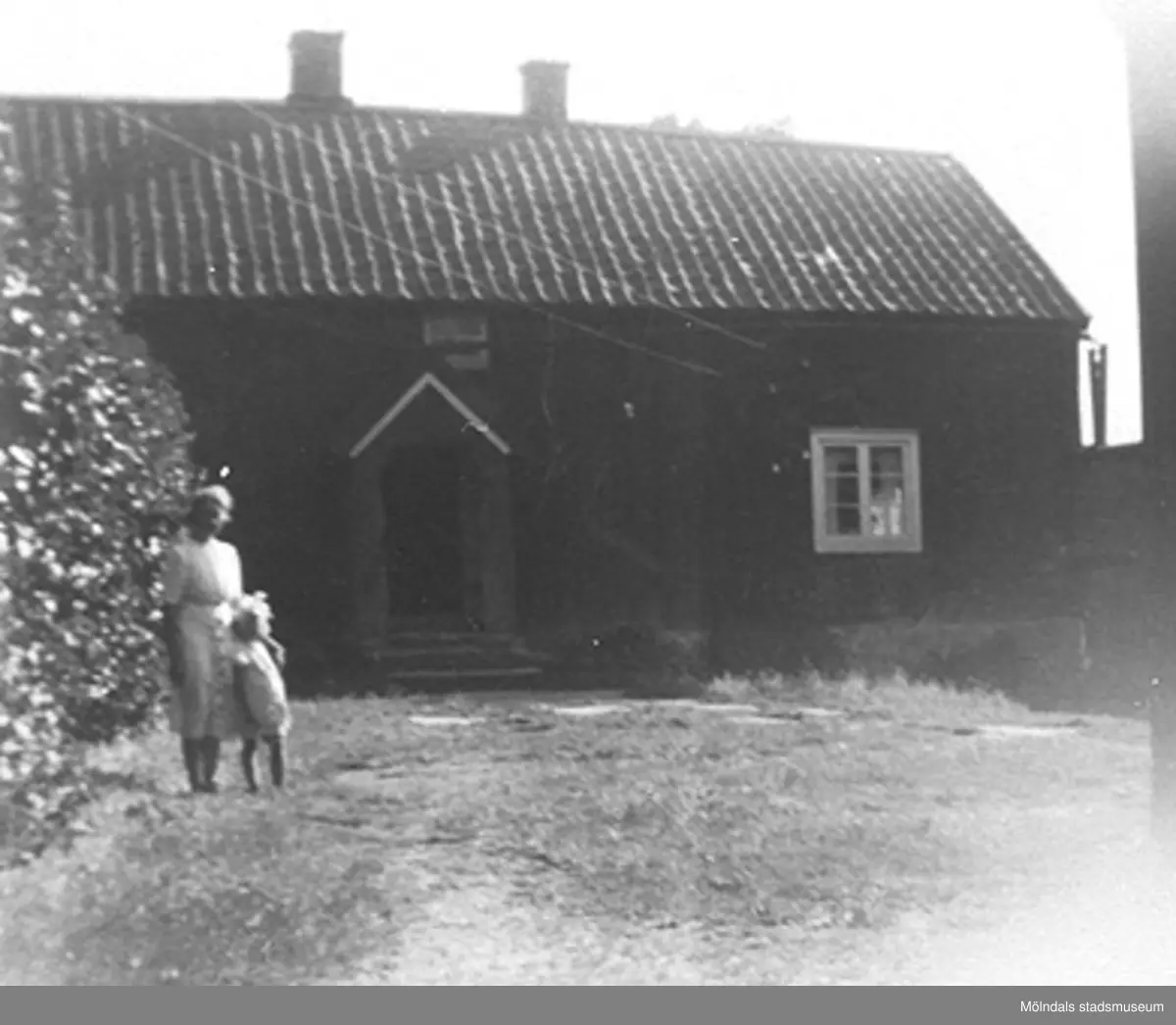 Anna Larsson (f. Hasselbergs) med dottern Berit. De står utanför Salves gård som var Annas morföräldrars bostad.