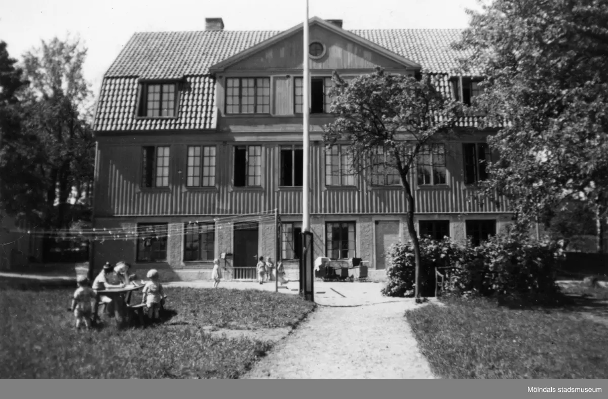 Mölndals barnhem, (f.d. Holtermanska) Rudbergsgatan. Framför huset står barnvagnar, barn leker i trädgården. Direktören Martin Holterman i Ostindiska kompaniet ägde Åby gård. 1782 skänkte han 3000 daler silvermynt till Fässbergs församling + ett nybyggt skolhus och trädgård på gårdens ägor vid Åby by. I skolan skulle 10 fattiga barn undervisas i "kristendom, skrivande och något räknande. Holtermans skola fanns kvar till 1875. Då hade donationens ändamål ändrats, och man byggde i stället ett barnhem kombinerat med småskola. 1914 brann barnhemmet och 1915 byggdes ett nytt barnhem på samma tomt. 1929 överlämnades barnhemmet till Mölndals stad.