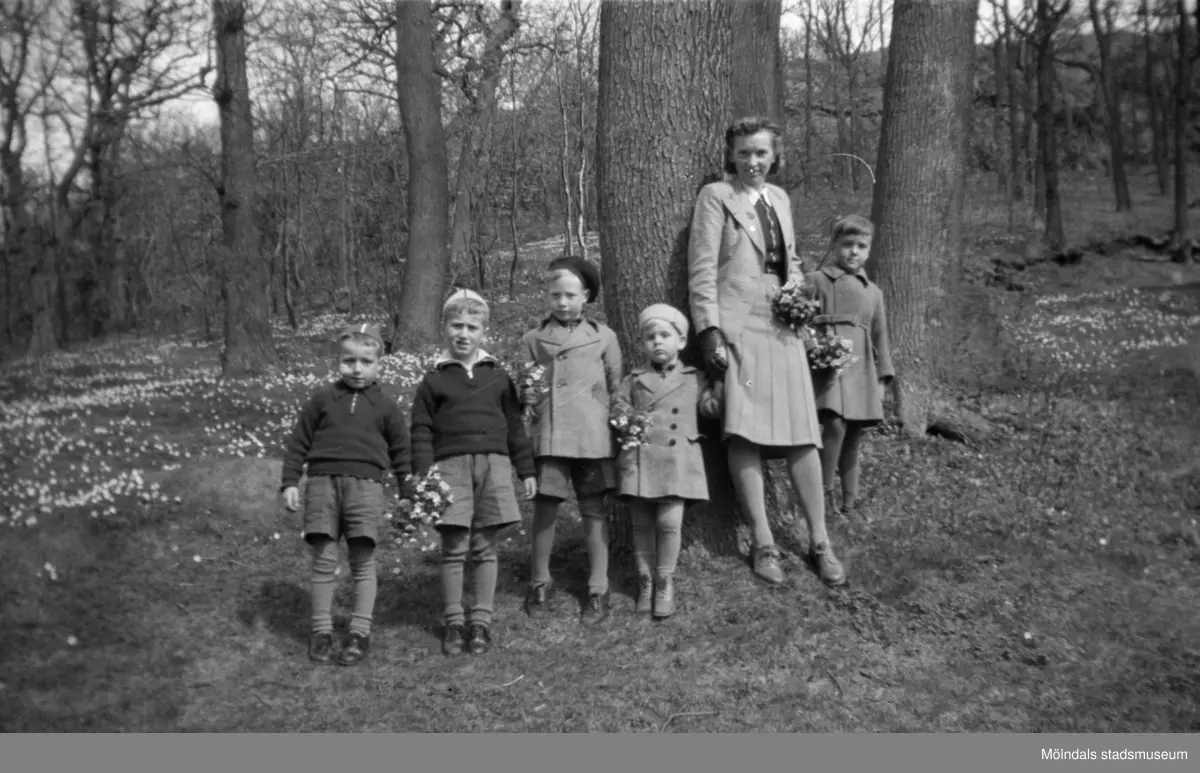 Barn med vårdare i vitsippshage. Mölndals barnhem (f.d. Holtermanska) Rudbergsgatan.