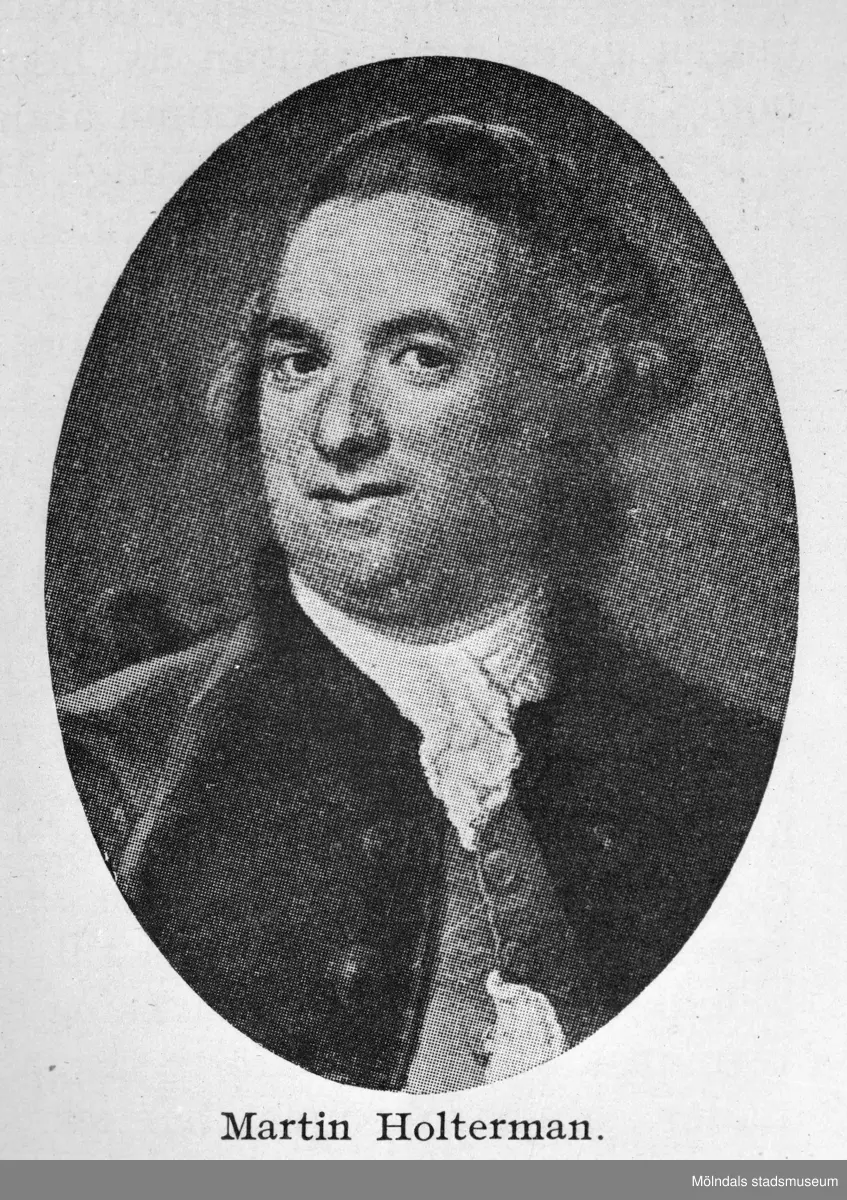 Foto av porträttmålning av Martin Holterman som startade Mölndals barnhem, Holtermanska, på 1700-talet. Direktören Martin Holterman i Ostindiska kompaniet ägde Åby gård. 1782 skänkte han 3000 daler silvermynt till Fässbergs församling + ett nybyggt skolhus och trädgård på gårdens ägor vid Åby by. I skolan skulle 10 fattiga barn undervisas i "kristendom, skrivande och något räknande. Holtermans skola fanns kvar till 1875. Då hade donationens ändamål ändrats, och man byggde i stället ett barnhem kombinerat med småskola. 1914 brann barnhemmet och 1915 byggdes ett nytt barnhem på samma tomt. 1929 överlämnades barnhemmet till Mölndals stad.