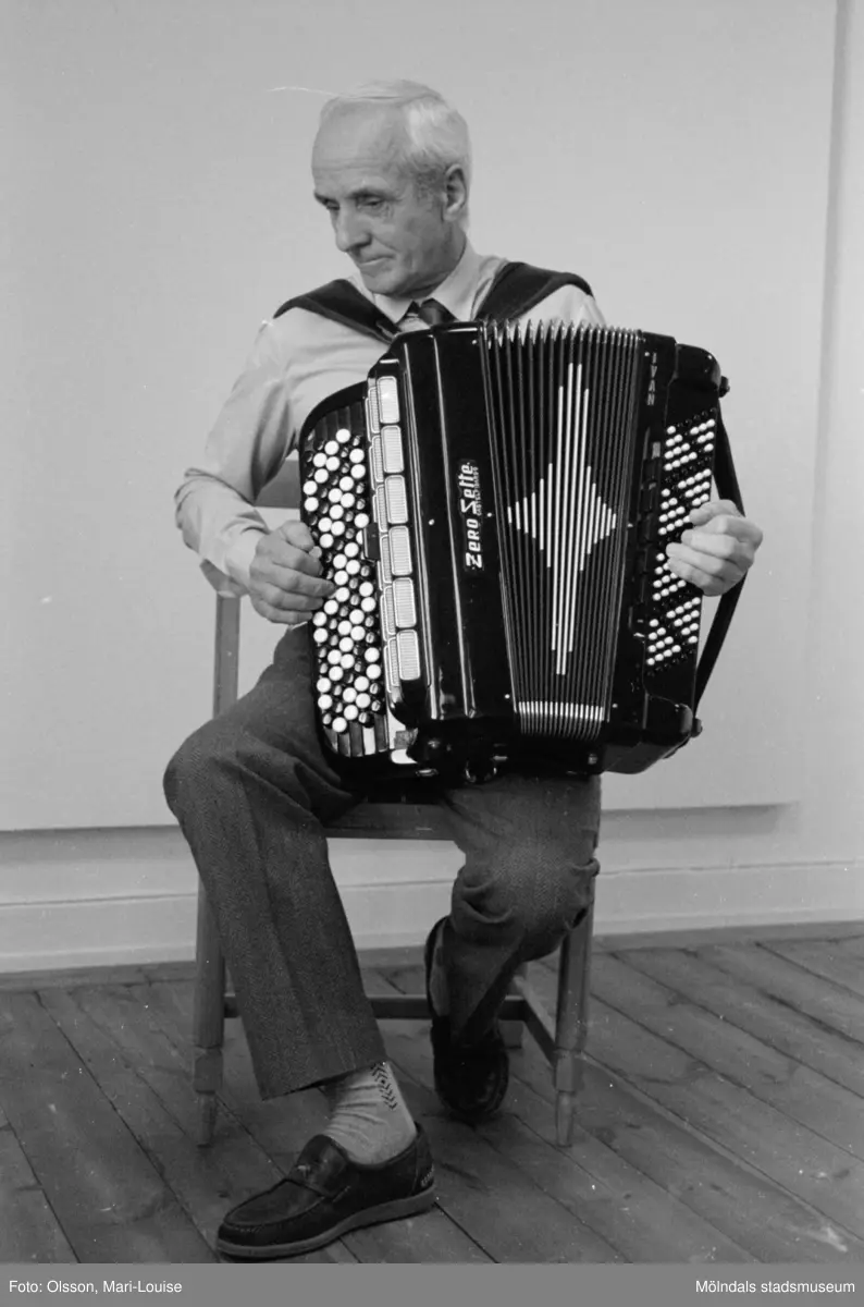 Ivan Svensson, ordförande i Mölndals dragspelsklubb, spelandes dragspel. Mölndals kvarnby 1990.