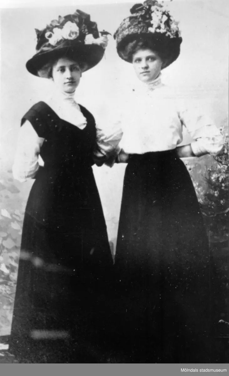 Två unga damer iklädda blommiga hattar och festkläder vid 1900-talet början.