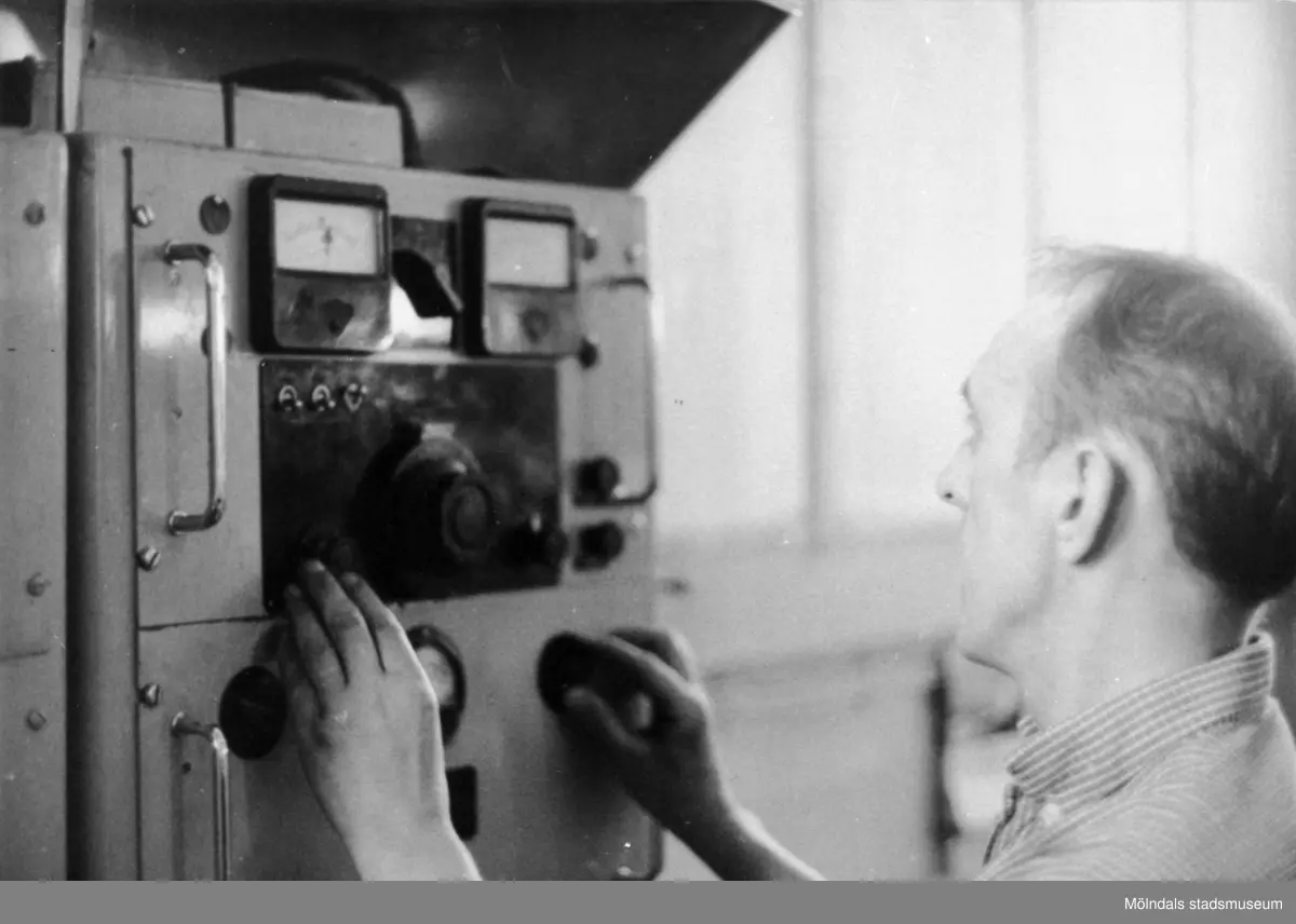 Anders "dansken" vid gramviktsmätaren vid Pappersmaskin 10 på Papyrus, 1962.