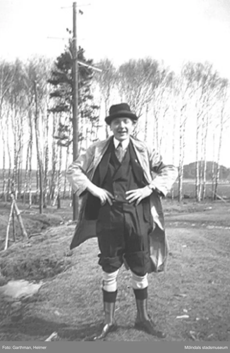 Helmer Garthmans kompis Charlie Jinnerstedt, ståendes i ett avverkat skogsområde, har dragit upp kostymbyxorna. Göteborg, 1940-tal.