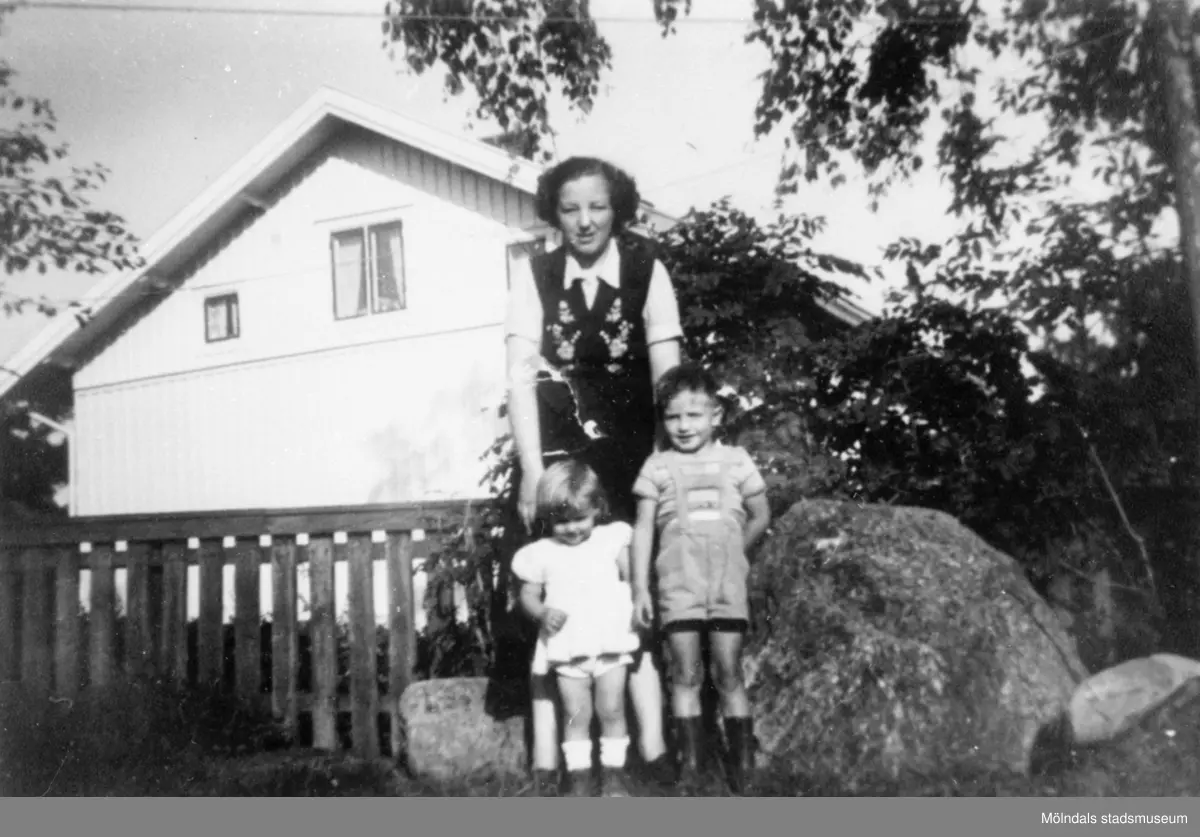 Modern Anne-Marie Lindholm, med barnen Marie-Louise och Benny, står i trädgården. I bakgrunden ses gaveln på Roten K 22, 1950-tal.