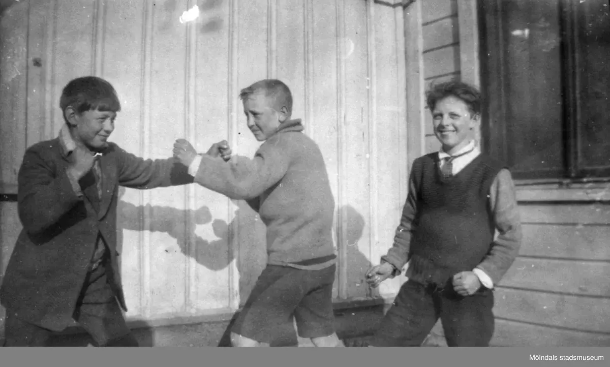 Två killar som låtsas-bråkar och en ung Helmer Garthman längst till höger. 1920-tal.