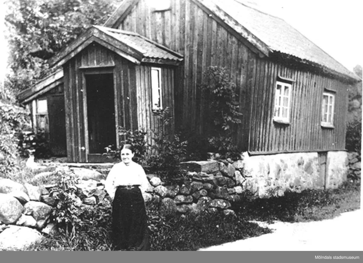 Annestorp i Lindome på 1920-talet. Maria utanför sin stuga. (anteckning av H.B). Maria var rörelsehindrad och arbetade på fabriken. Hon var född 1846.