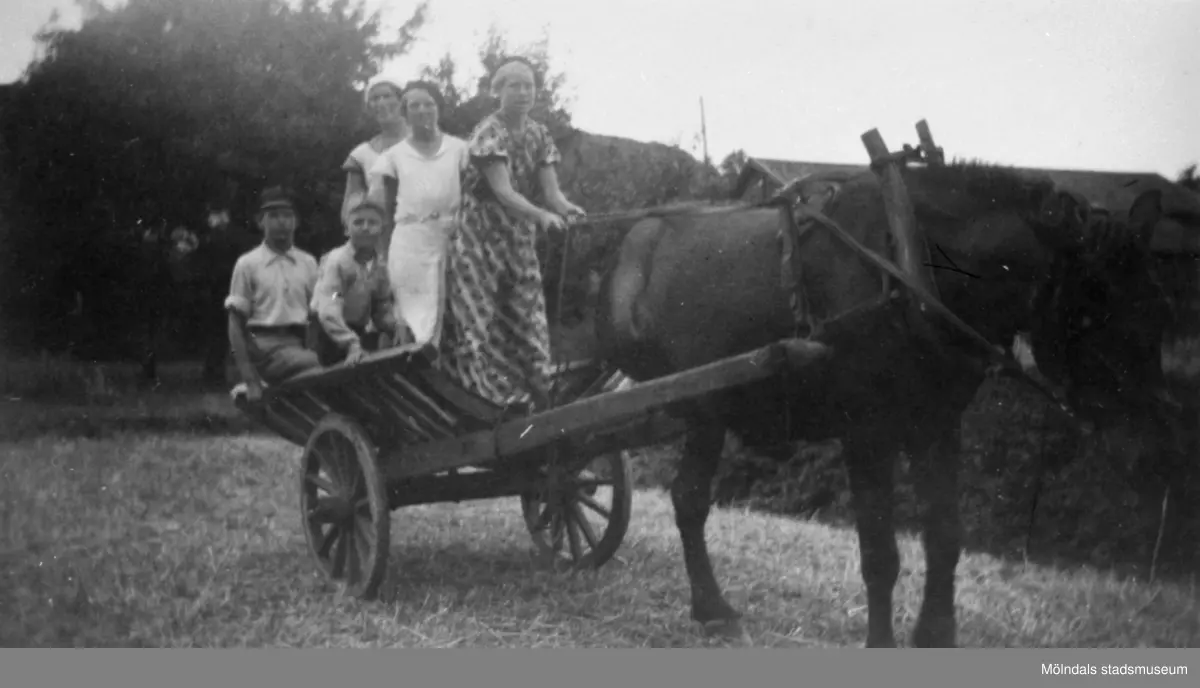 Häst och vagn med barn och ungdomar. Kusk är Gördis och bakom henne står Sonja och Valborg, Carl-Uno och Bengt sittande. Kållered 1930-tal.