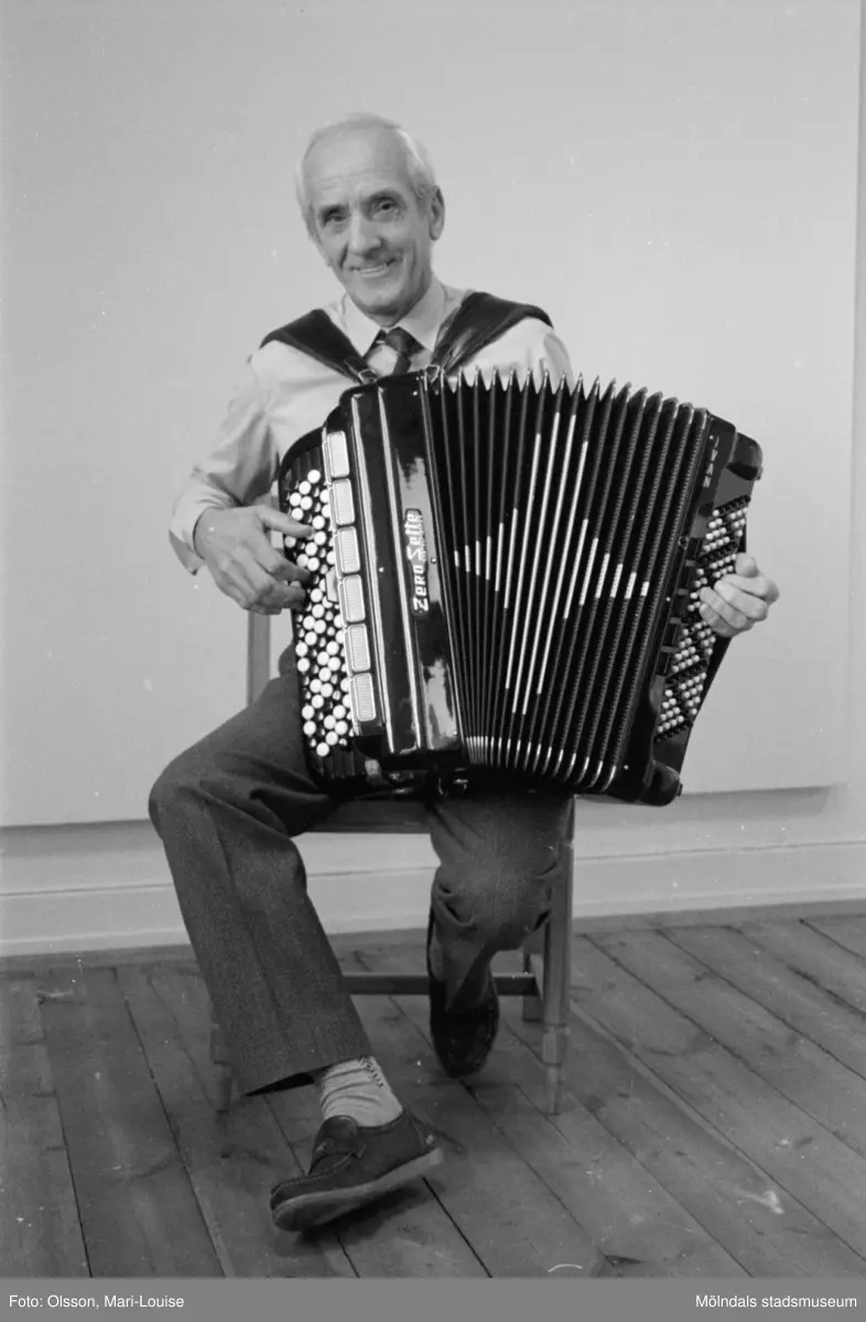 Ivan Svensson, ordförande i Mölndals dragspelsklubb, spelandes dragspel. Mölndals kvarnby 1990.