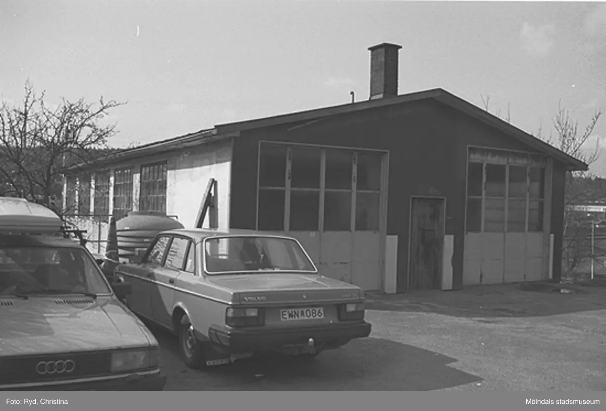 Utanför den offentliga byggnaden står det två bilar. Gamla Riksvägen 34 i Kållered. Bilden är tagen 1991.