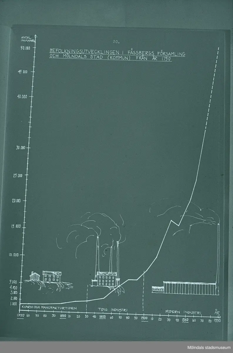 Befolkningsutvecklingen i Fässbergs församling och Mölndals stad (kommun) från år 1750. 1894 dog den store industrimannen Francke efter att ha gjort konkurs. Nästa svacka har samband med bristen på råvaror (=arbetslöshet) under 1930-talet. Illustration i Helena Jakobssons bok om Mölndals Kvarnby från 1972.
