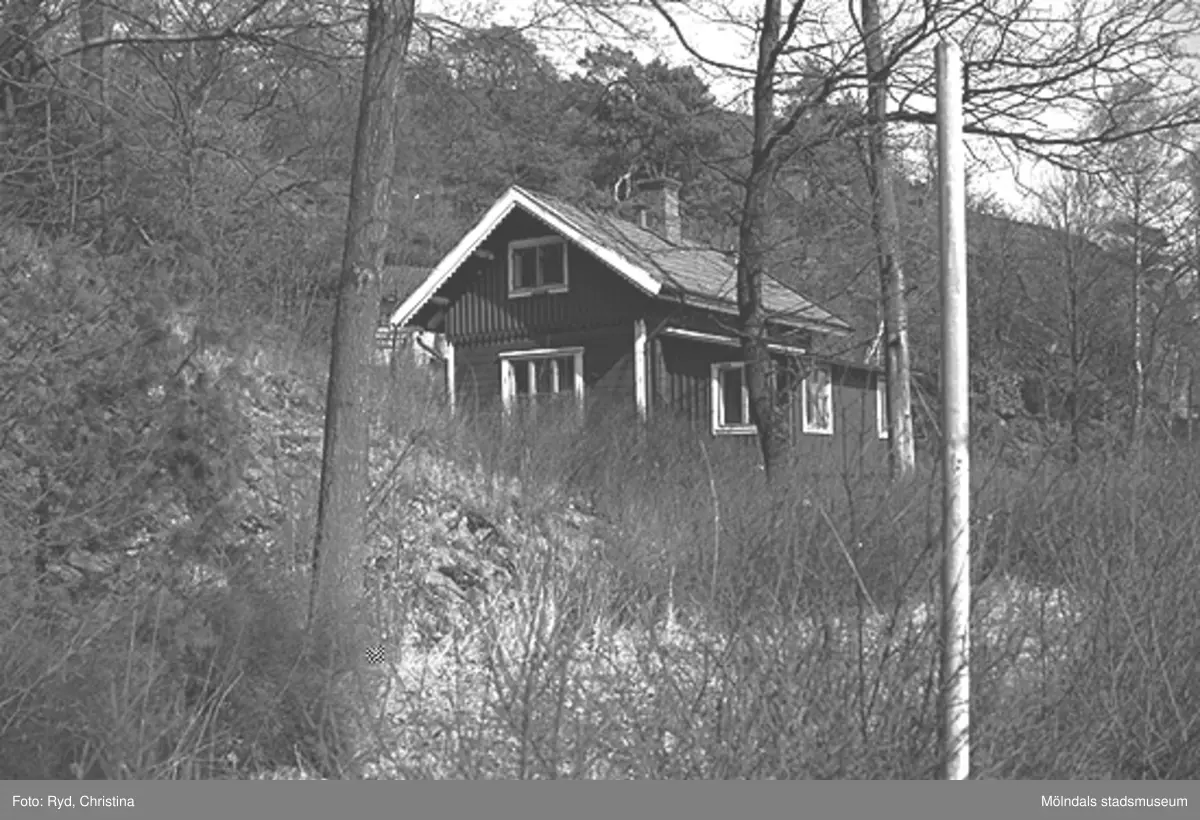 "Gröne backe" på Rådavägen 7, Sjövalla 1:1, Stensjön. Denna bruna träpanelsvilla låg vackert belägen intill Rådavägen i den gröna backen norr om Stensjön. Villan revs 1991. Bilden är tagen 1991.