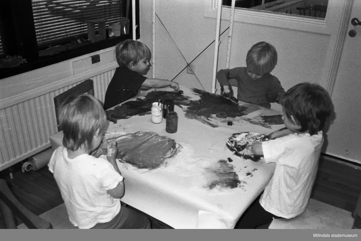 Dagisbarnen Henrik, Fred och Alexandra samt okänd sitter och målar teckningar kring ett bord på Lunkentussen, Katrinebergs daghem 1992-93.
