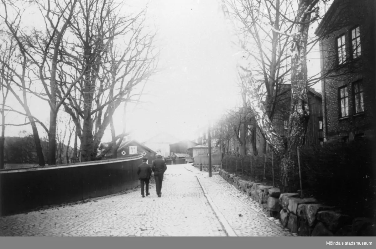 Två män promenerar på Forsåkersgatan mot norr. Till höger syns sjukstugan (senare polishus och Mölndals museum) samt Svennings hus. Norra Forsåkersgatan 19, år 1921.