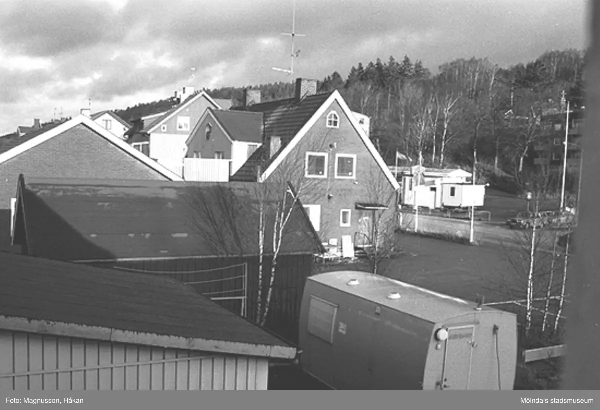 Utsikt från Kållereds stations köksfönster på Våmmedal 3:135 i Kållereds centrum, februari 1991.