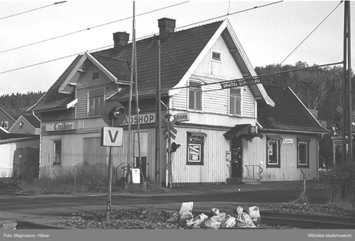 Utsikt mot Kållereds stations köksfönster på Våmmedal 3:135 i Kållereds centrum, februari 1991.