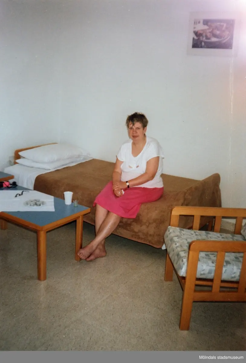 Maj Jernberg sitter på sin säng. Maj bodde på Streteredshemmet i Kållered troligen från 1970-1980-talet fram till början av 1990-talet. Detta fotografi är dock taget på ett annat gruppboende.