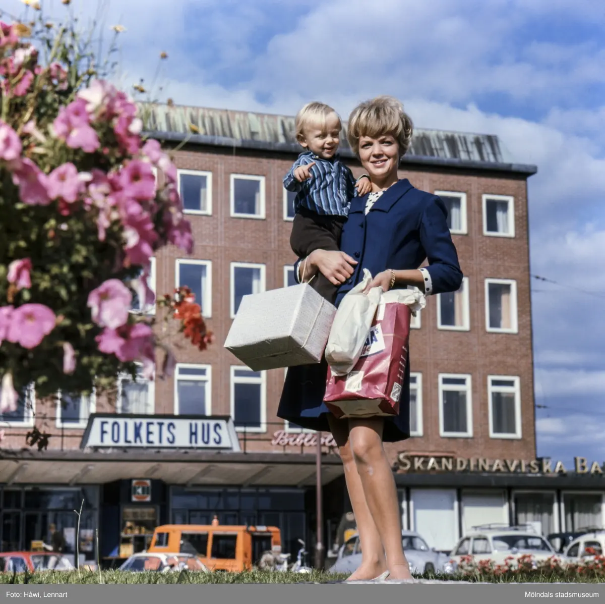 Titel: Kvinna med pojke i famnen fotograferade vid Stadshusplatsen i Mölndal, 17/9 1968.