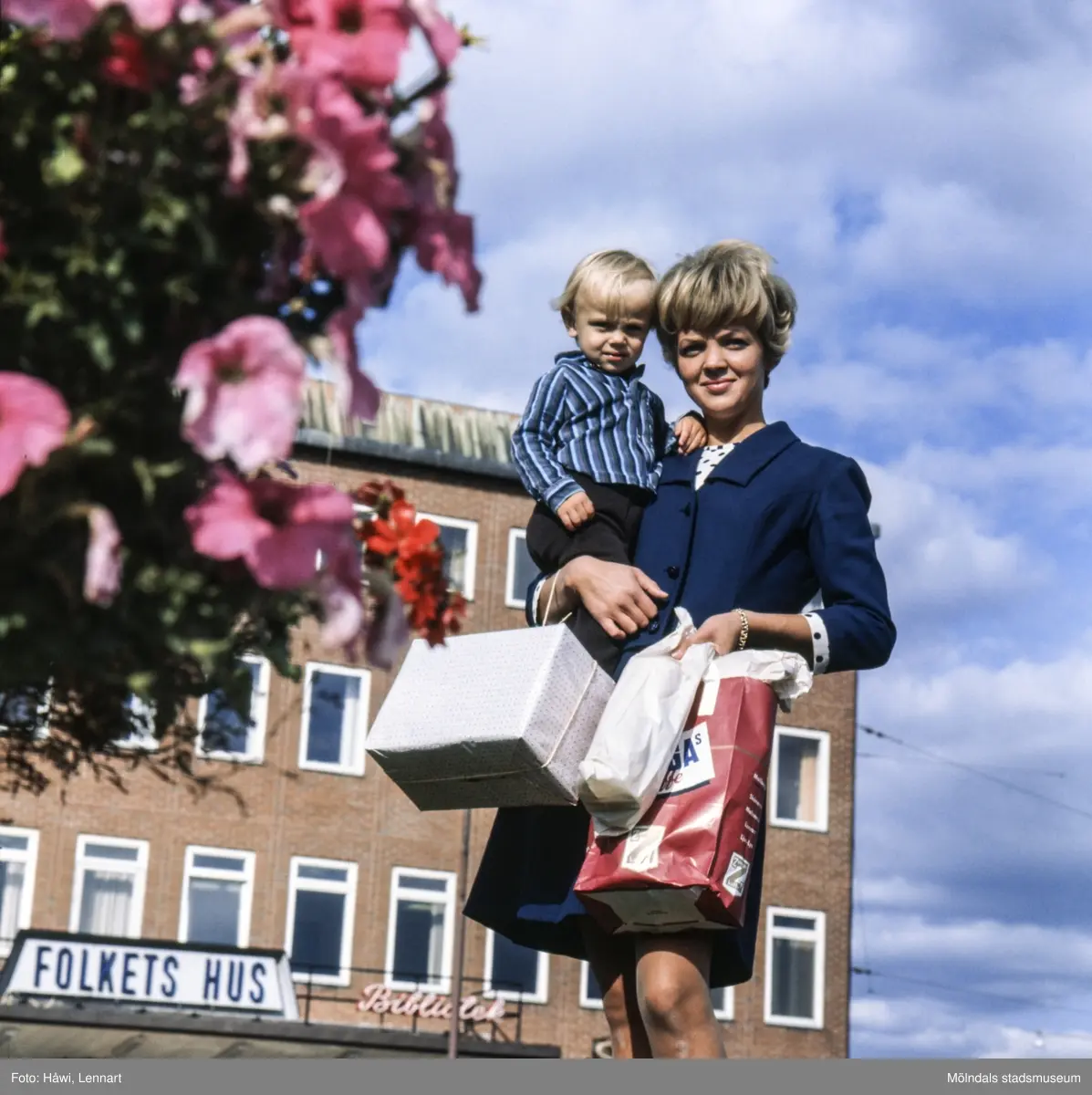 Kvinna med pojke i famnen fotograferade vid Stadshusplatsen i Mölndal, 17/9 1968.