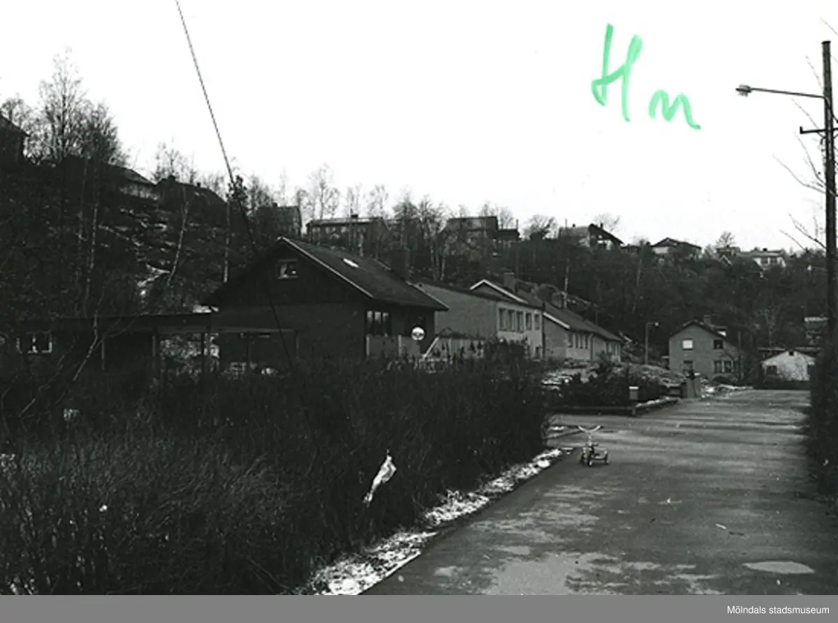 Bostadshus längs Slingergatan i Toltorpsdalen, Mölndal, 1970-tal. På gatan står en trehjuling.