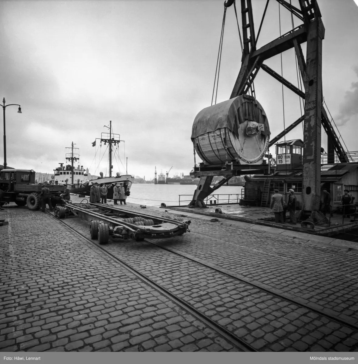 Transport av pappersbruket Papyrus PM2 yankeecylinder. Cylindern lastas på ett lastfordon med hjälp av lyftkran. Göteborgs hamn, 16/4 1957.
