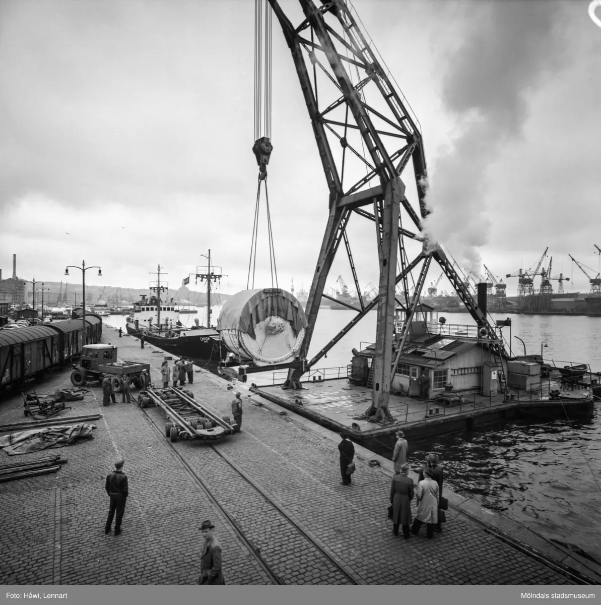 Transport av pappersbruket Papyrus PM2 yankeecylinder. Cylindern lastas på ett lastfordon med hjälp av lyftkran. Göteborgs hamn, 16/4 1957.