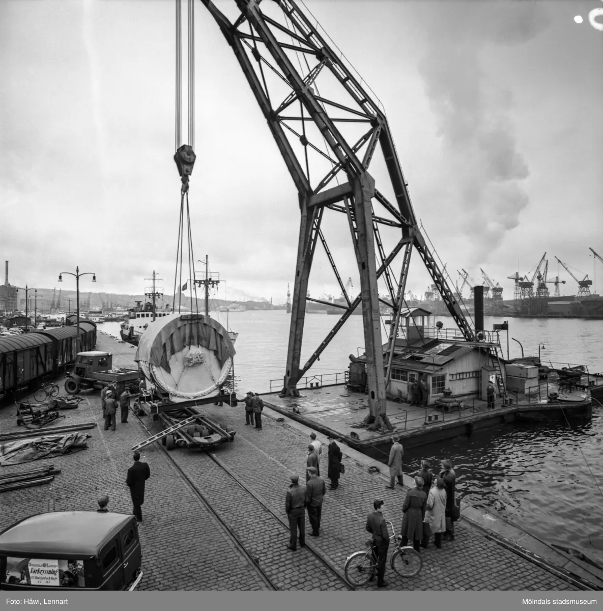Transport av pappersbruket Papyrus PM2 yankeecylinder. Cylindern lastas på ett lastfordon med hjälp av lyftkran. Göteborgs hamn, 16/4 1957.
