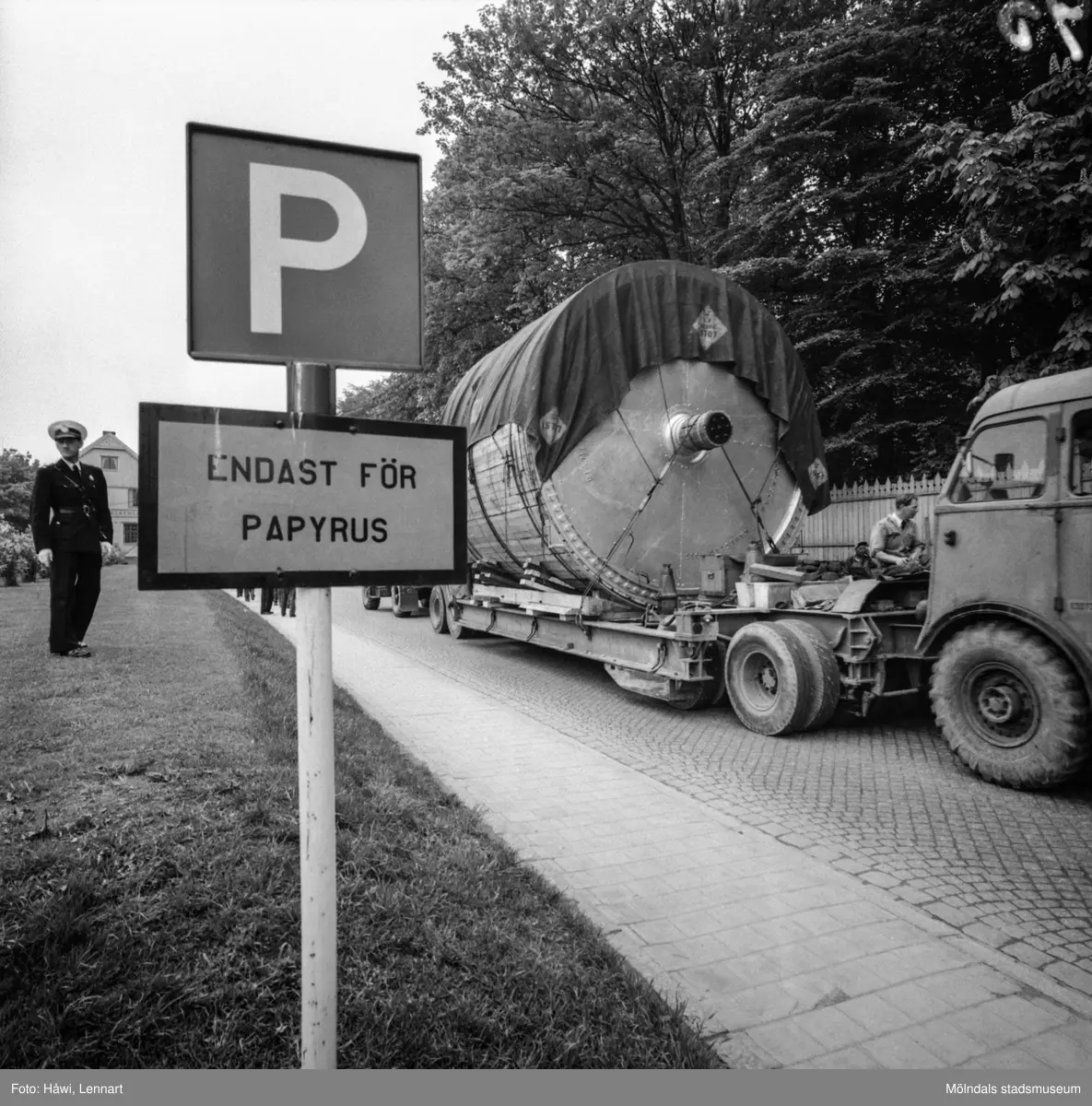 Titel: Transport av pappersbruket Papyrus PM2 yankeecylinder. Cylindern fraktas med lastfordon mot Papyrus i Mölndal, 2/6 1956.