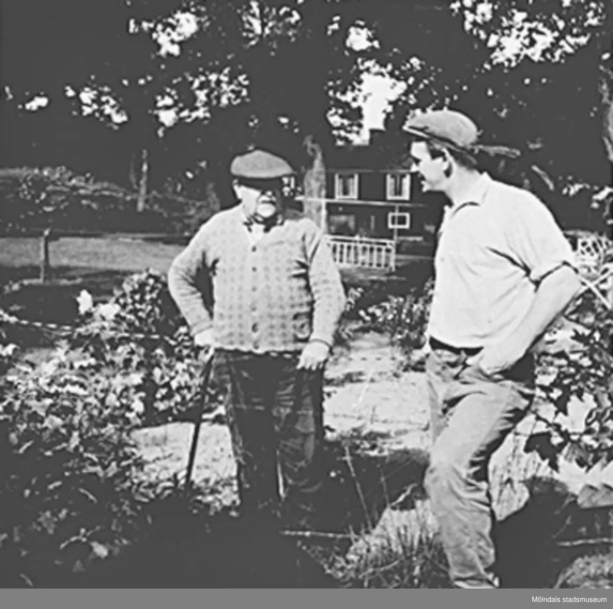 Två män står i en trädgård i Kållered, 1940-tal. I bakgrunden ses en stuga.