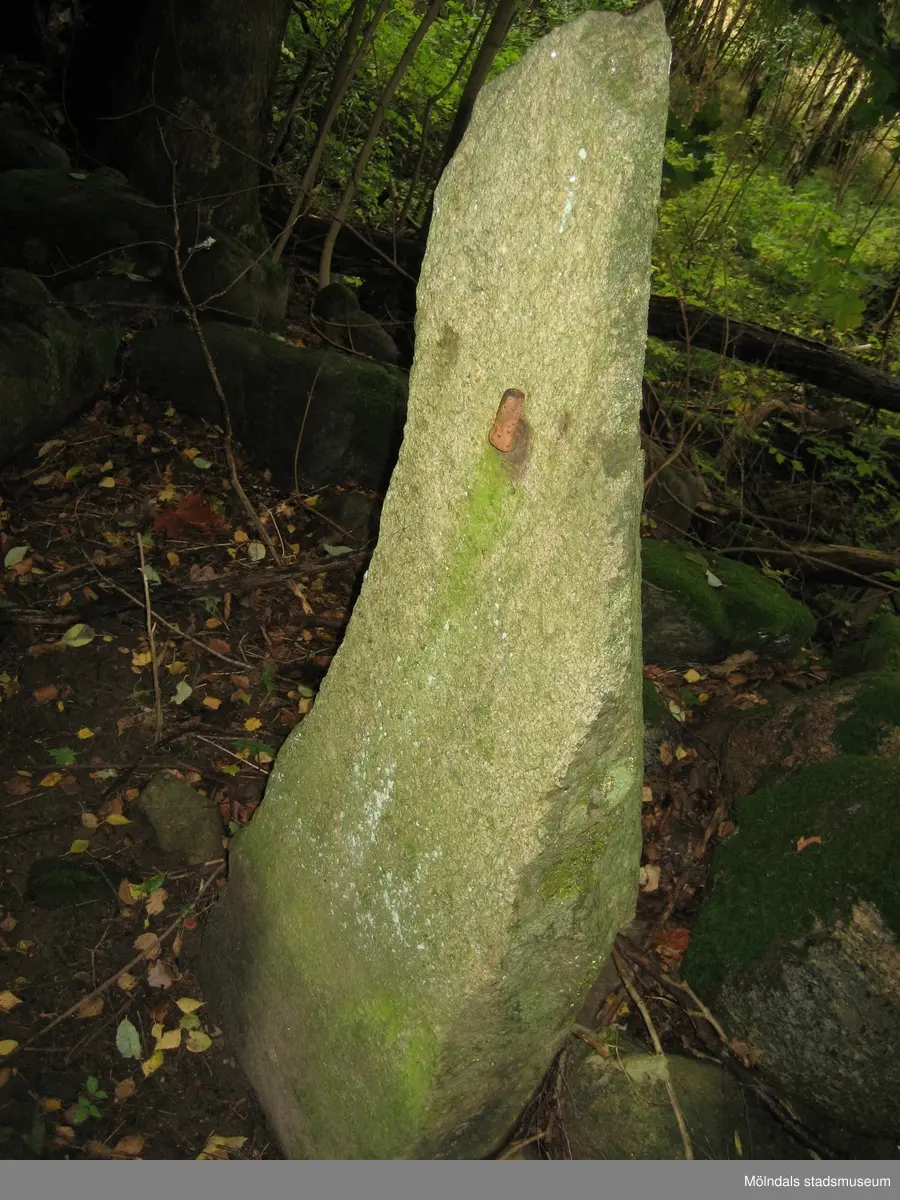 Gårdarna Bunketorp och Taljegården i Kärra, Mölndal. Grindstolpe av sten på fastigheten Balltorp 1:124. Fotografi taget den 25/9 2012. Byggnadsdokumentation inför rivning.