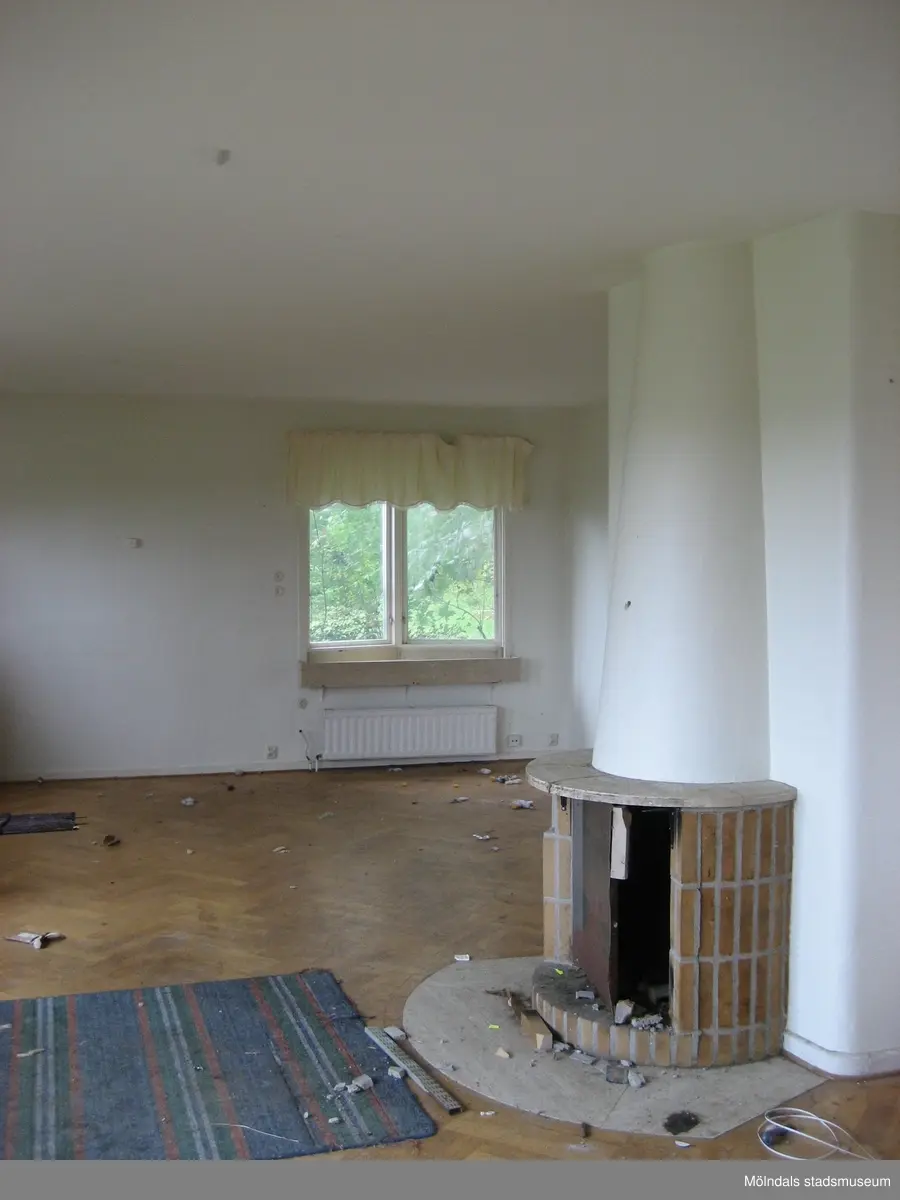 Gården Taljegården 1 i Kärra, Mölndal. Interiörfotografi av rum i bostad på fastigheten Balltorp 1:124. I rummet står en öppen spis. Fotografi taget den 25/9 2012. Byggnadsdokumentation inför rivning.