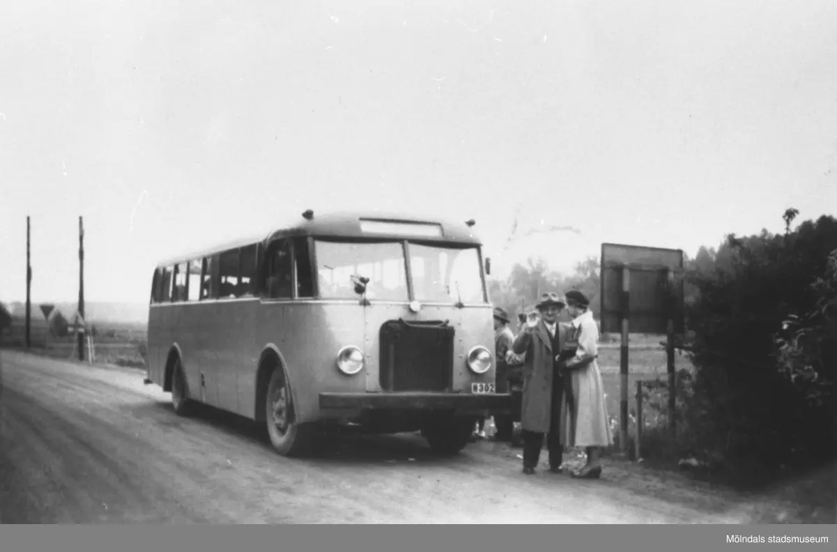 En Kålleredsbuss med passagerare har stannat till vid vägkanten, okänt årtal och plats.