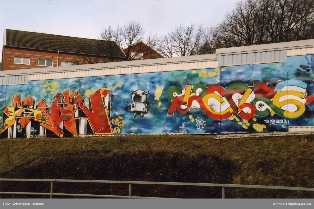 Graffiti längs Kvarnbygatan i Mölndal, år 2003.