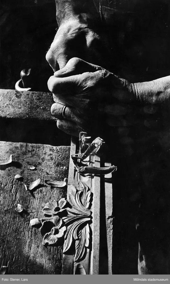 Snickaren Albert Palmstedt handarbetar. Albert tillverkade bland annat Göteborgsstolar. Han avled 1974. Fotografiet är förmodligen taget i slutet av 1960-talet, i alla fall före sommaren 1969.