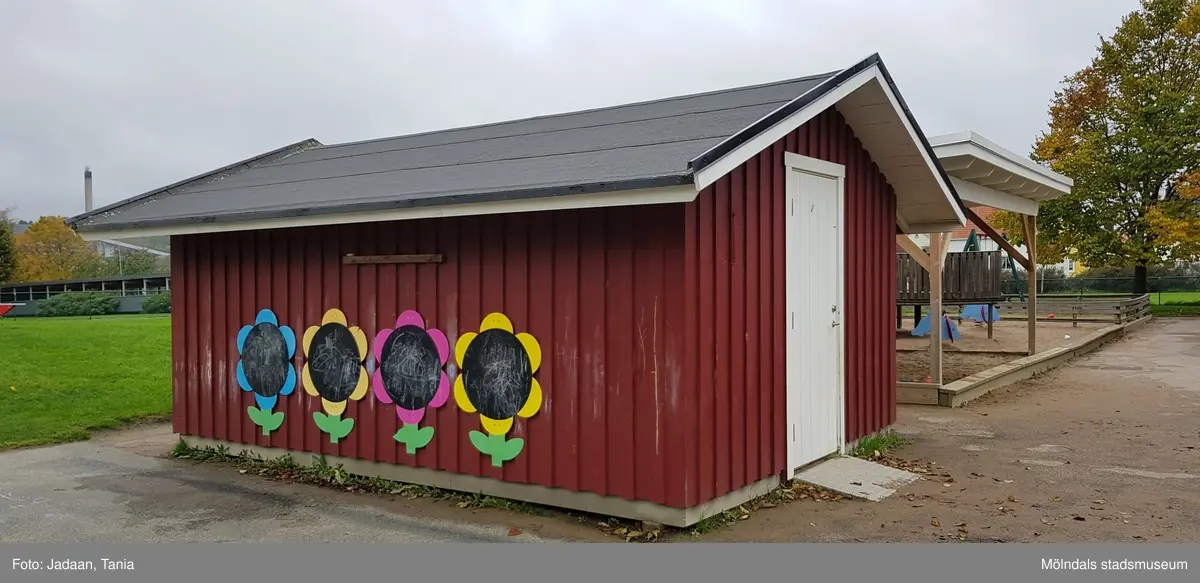 Förråd tillhörande Gärdesängens förskola som har adress Måldomargatan 1 i Åbyområdet, Mölndal. Fastighetsbeteckning är Kallblodet 1. Fotografiet är taget den 9/10 2018. Byggnadsdokumentation inför rivning.