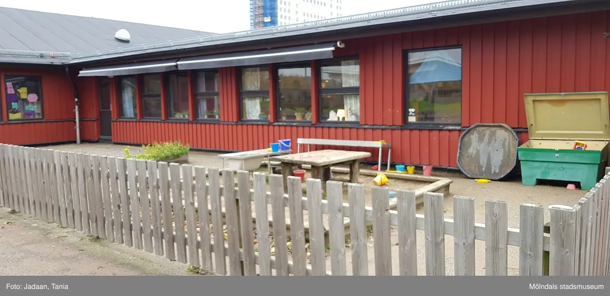 Titel: Gärdesängens förskola med adress Måldomargatan 1 i Åbyområdet, Mölndal. Fastighetsbeteckning är Kallblodet 1. Fotografiet är taget den 9/10 2018. Byggnadsdokumentation inför rivning.