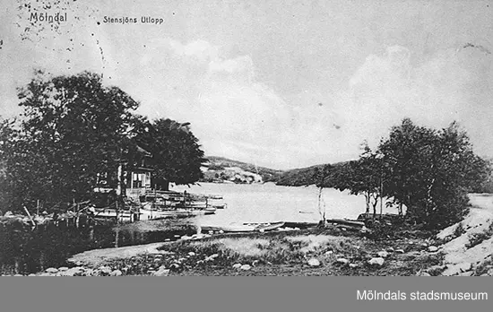 "Stensjöns Utlopp" (Mölndalsåns utlopp ur Stensjön) sett från södra stranden av utloppet mot Gunnebobro i nordost, cirka 1930. Till vänster ses Sjövillans brygghus och garage.