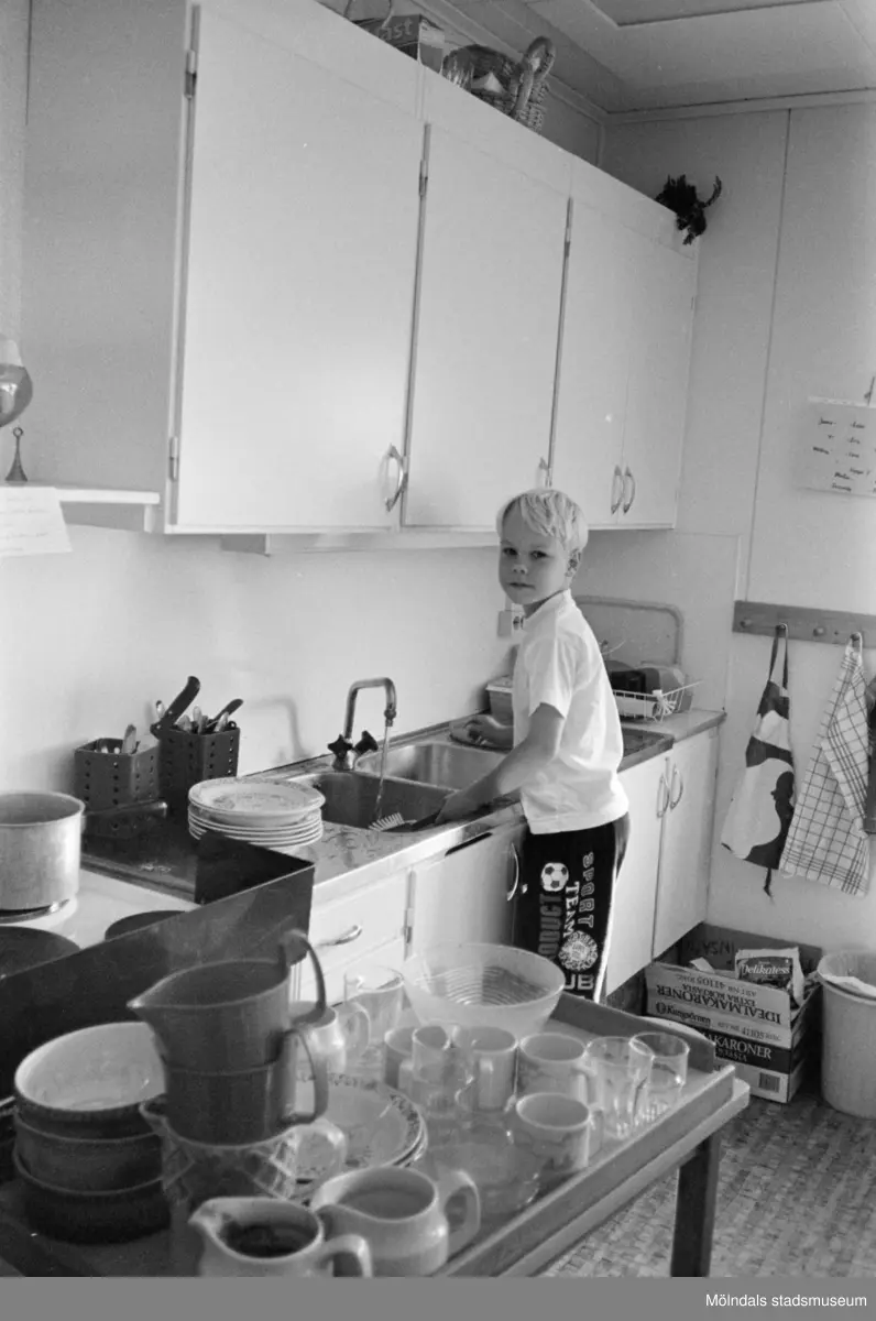 Jimmie H står på en stol vid diskbänken och diskar. Hoppetossan, Katrinebergs daghem 1992-93.