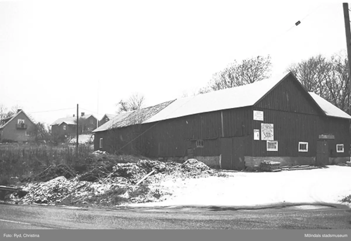 Rondellbygge vid Ranntorp 1:3 i Lindome. Den nya "trafikmaskinen" vid korsningen Gamla Riksvägen-Spårhagavägen slukade våren 1991 dessa förrådsbyggnader. De låg alldeles intill byn "Nedre Rantorp", som då blev undersökt genom en arkeologisk utgrävning. Bilden är tagen under 1990-talet.