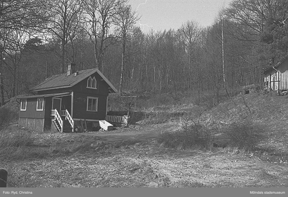 "Gröne backe" på Rådavägen 7, Sjövalla 1:1, Stensjön. Denna bruna träpanelsvilla låg vackert belägen intill Rådavägen i den gröna backen norr om Stensjön. Villan revs 1991. Bilden är tagen 1991.