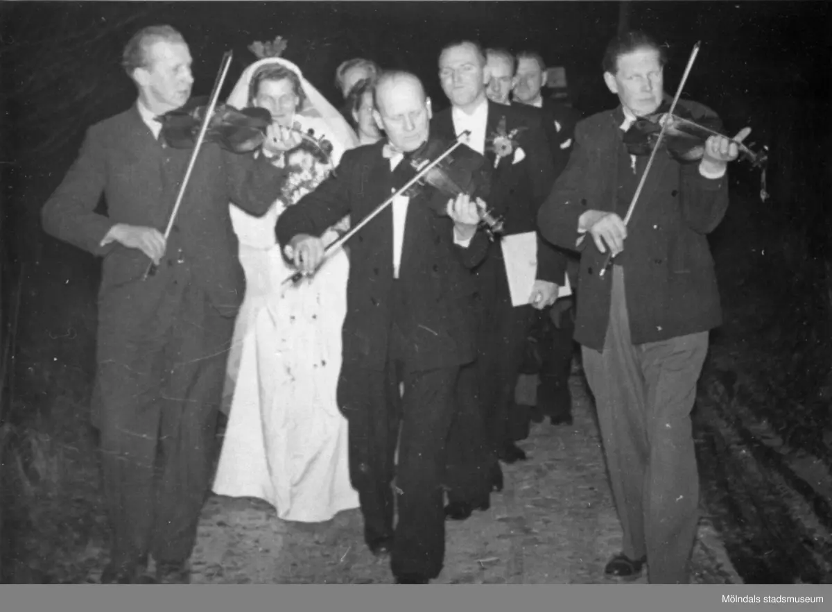Bröderna Svensson spelar på bröllop i Halland 1955. Bruden Ejvor Axelsson och brudgummmen Arne Axelsson.