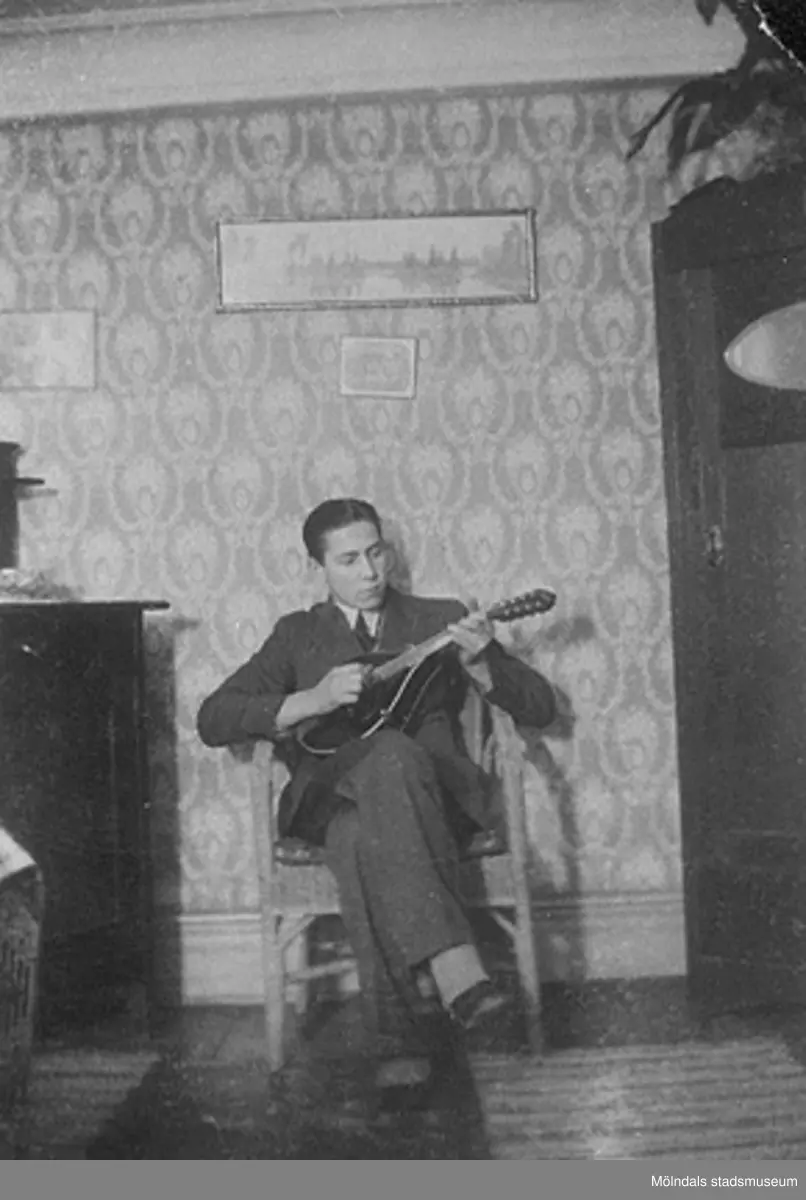 På bilden spelar Lasse Mattsson, kamrat till Vitalis Örtlund, mandolin i Åkes, Annas och Vitalis föräldrahem. Bild från början av 1930-talet.
